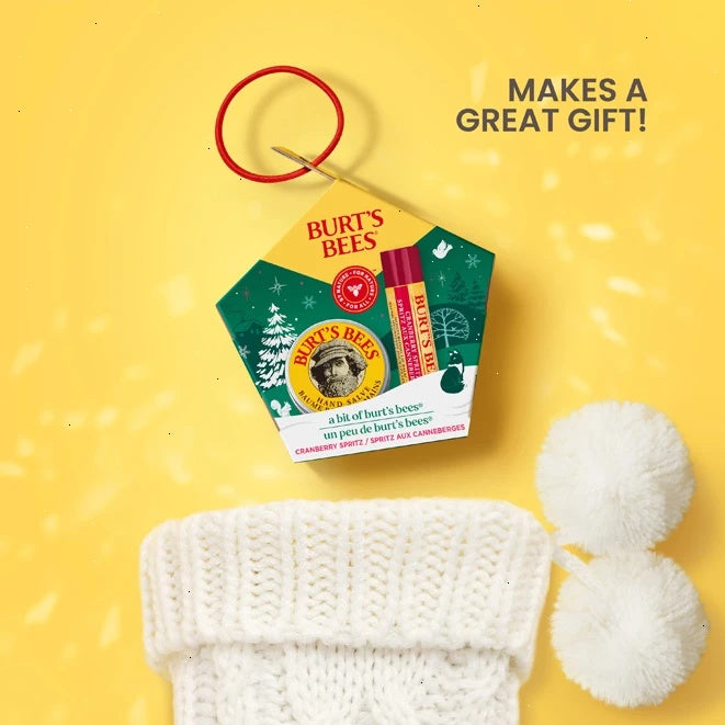 Give your loved ones the gift of soft skin and lips with this Burt's Bees Cranberry Spritz Lip Balm and Hand Salve Gift Set. Infused with cranberry flavor and nutrient-rich botanicals, this lip balm makes lips feel juicy, happy and healthy. It glides on smoothly, leaving behind a tint-free, matte finish and smooth, supple lips that everyone will be buzzing about. Brimming with botanical oils, herbs and responsibly-sourced beeswax, the hand salve delivers the hydration your dry hands need.