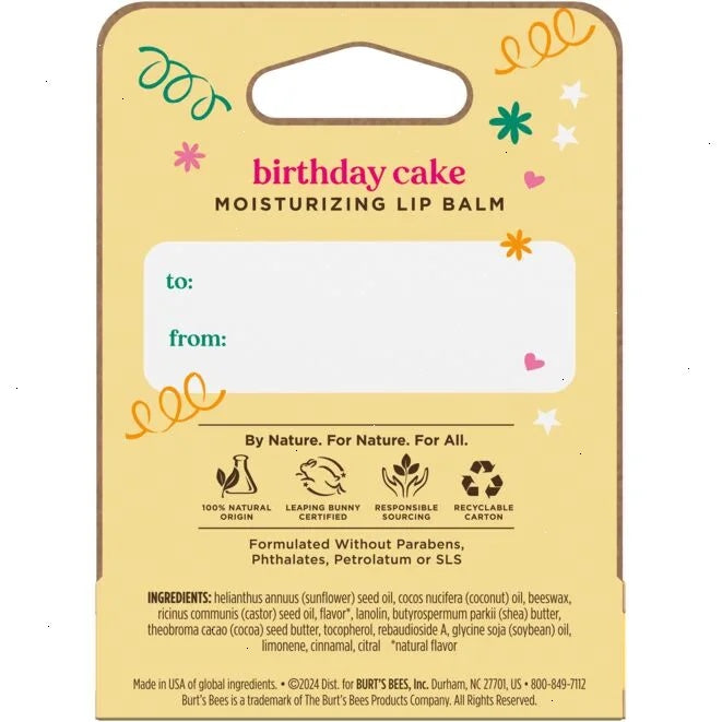 A sweet treat to celebrate someone’s special day, Burt’s Bees® Birthday Cake Moisturizing Lip Balm has delectable birthday cake flavor. A fun gift for all, this moisturizing lip balm is ready for gifting in festive, birthday themed packaging.