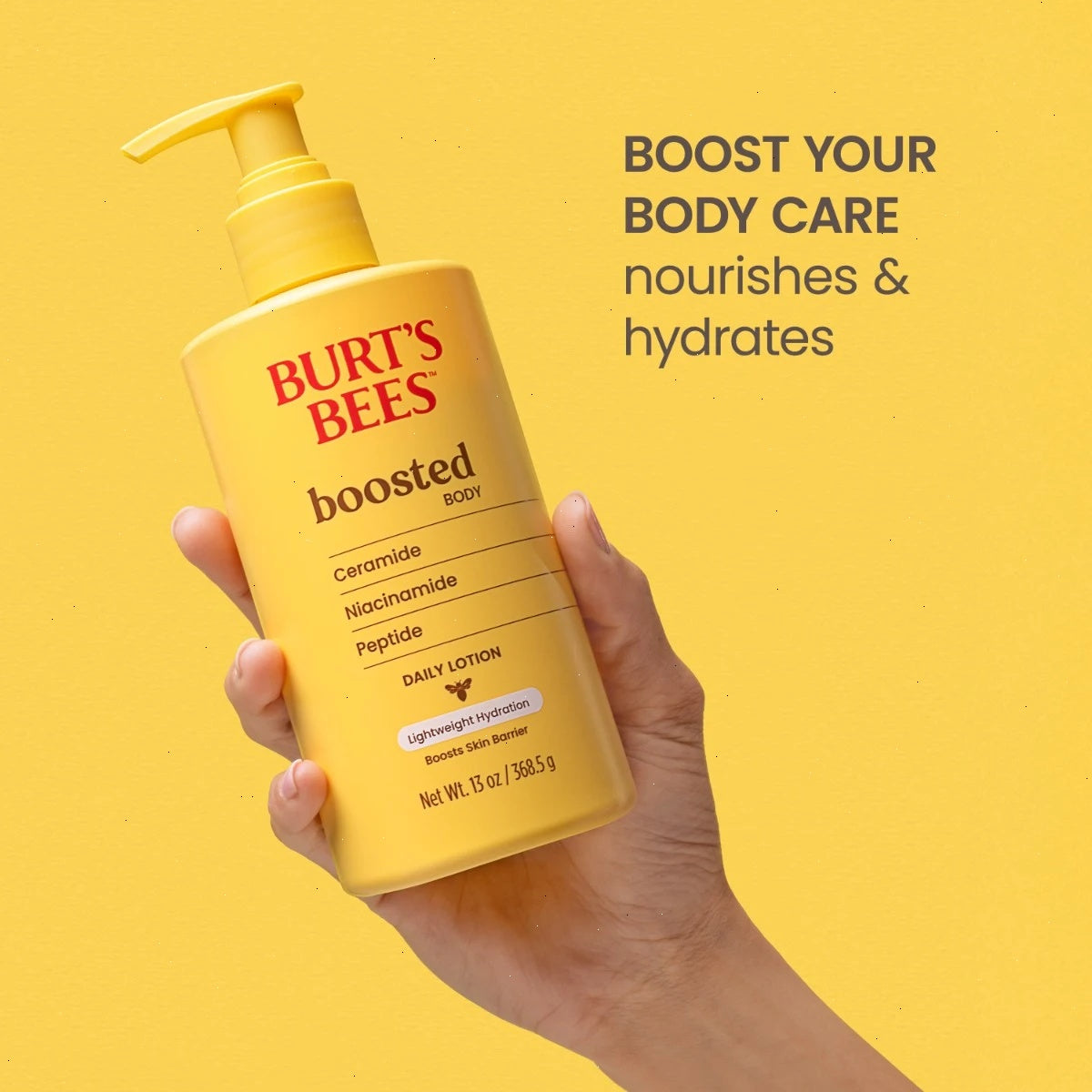 Elevate your skin care routine with Burt's Bees Boosted Body Lotion, a lightweight daily lotion formulated to boost skin barrier. Packed with powerful ingredients, this body moisturizer contains a triple-action ceramide, niacinamide, and peptide complex to help to boost the skin barrier. The lightweight lotion absorbs quickly while providing long-lasting skin hydration without greasy residue. It has an energizing scent that is vibrant and tropical with notes of guava and melon, complemented by exotic grapefruit, sheer florals and a smooth blend of amber woods and musk.
