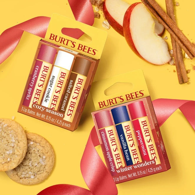 Burt’s Bees Winter Wonders Moisturizing Lip Balms condition and hydrate lips in holiday inspired flavors, perfect for gifting. This limited edition 3 pack includes Cinnamon Apple Crisp, Vanilla Bean, and Peppermint flavors. These tint free lip balms glide on smoothly with responsibly sourced beeswax to moisturize lips and keep them hydrated for up to 24 hours.