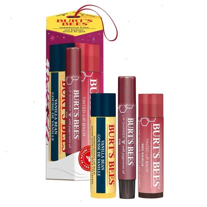 Stay mistletoe-ready with soft, bright and shimmery lips when you use Burt's Bees Mistletoe Kiss Lip Balm, Tinted Lip Balm and Lip Shimmer Gift Sets. Bursting with all-natural vanilla, shea butter and vitamin E, the flavored lip balm happily hydrates and revitalizes your lips. Choose from a red or pink set. The Red Gift Set includes Red Dahlia Tinted Lip Balm, Fig Lip Shimmer, and Vanilla Bean Lip Balm. The Pink Gift Set includes Hibiscus Tinted Lip Balm, Peony Lip Shimmer, and Pomegranate Lip Balm. Burt's Bees tinted lip balms are made using botanical waxes and shea butter, delivering 8 hours of moisture and a hint of flattering neutral lip color. Burt's Bees Lip Shimmers are made with shea butter and antioxidant-rich fruit oils, and offer a smooch of luminescent pigmented color with high-impact moisture and an invigorating peppermint flavor.